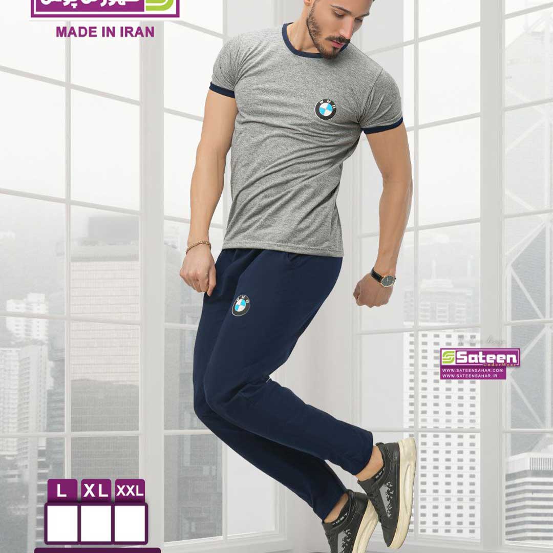 طراحی: تیشرت طوسی با آرم بی ام و و شلوار سرمه ای با آرم بی ام و